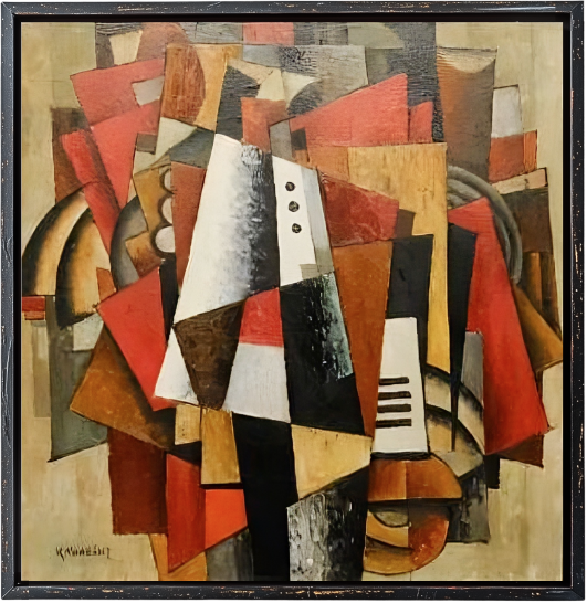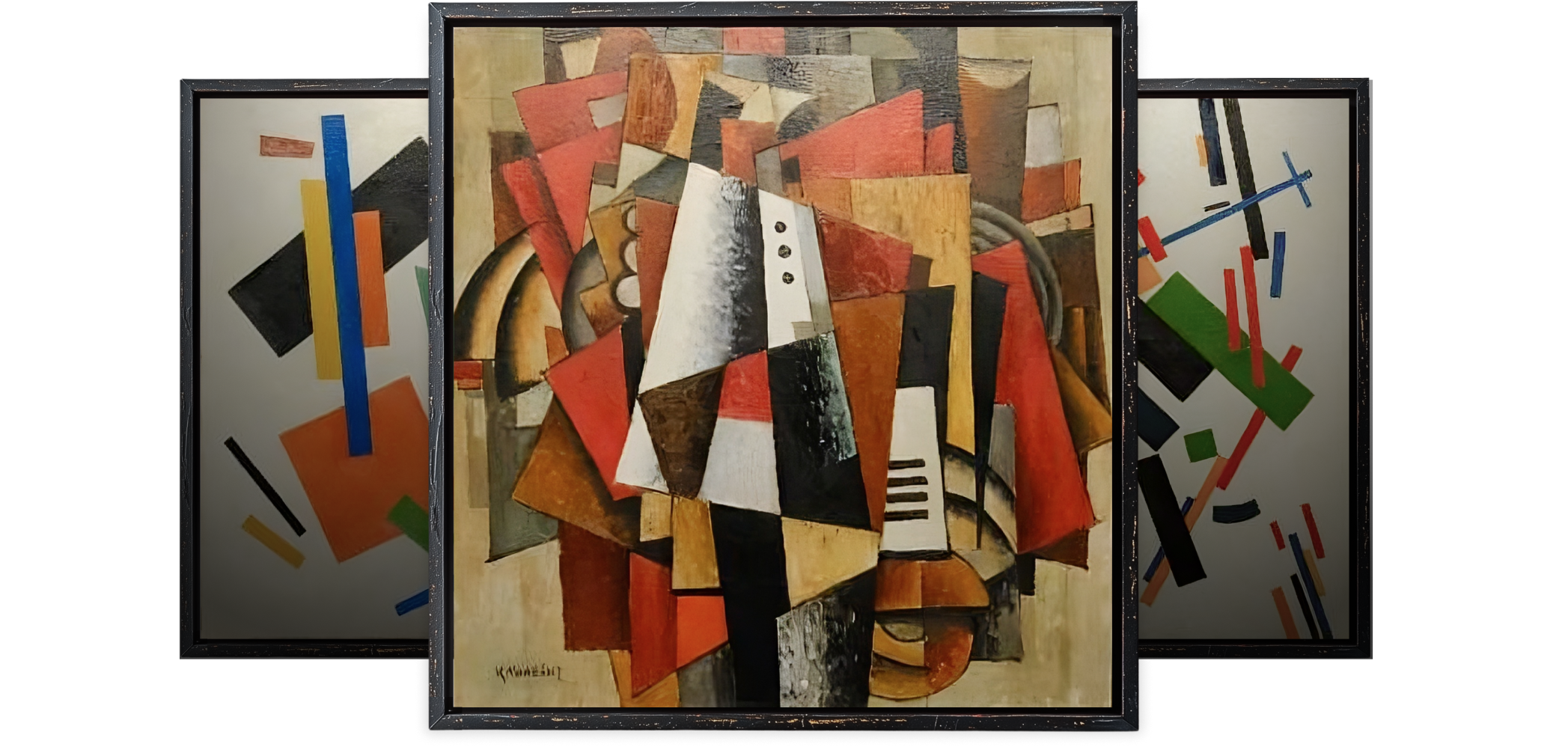 A vivid geometric painting from Malevich’s transitional period between Cubism and Futurism.